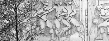 Constructed in precast concrete panels in 1974 the frieze ran the full length of the main facade of The Thomson Sports Centre, Burnley. The building was demolished in 2009 and the panels carefully removed, section by section from the building. The local Burnley Council made strenuous efforts to have the panels re-sited within the town with the help of local interested groups and received an offer of a grant from the Heritage Lottery Fund. Sadly the onset of the current recession and Government cutbacks forced the project to be abandoned. All seemed lost in spite of efforts by the Twentieth Century Society to highlight its plight.
